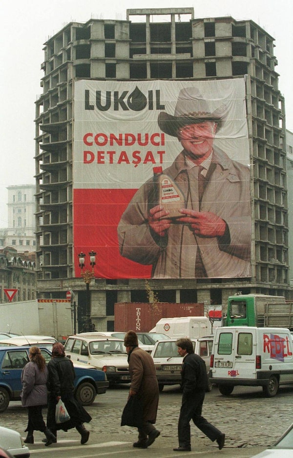 In this Thursday Nov. 18, 1999 file photo, people cross the street in downtown Bucharest, Romania near an unfinished apartment building draped with a poster of U.S. actor Larry Hagman as J.R. Ewing from the television show "Dallas." The poster is part of a high-profile advertising campaign for the Russian oil giant Lukoil. "Dallas" was one of the few American TV series the late communist dictator Nicolae Ceausescu allowed to be shown on Romanian television. Actor Larry Hagman, who for more than a decade played villainous patriarch JR Ewing in the TV soap Dallas, has died at the age of 81, his family said Saturday Nov. 24, 2012.Vadim Ghirda/The Associated Press