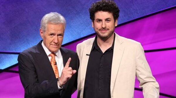 This Nov. 2015 photo provided by courtesy of Jeopardy Productions, Inc. shows host Alex Trebek, left, and winner Alex Jacob, 31, of the Jeopardy! Tournament of Champions. Jacob, a currency trader from Chicago, won the $250,000 top prize on the syndicated TV show's "Tournament of Champions" finale that aired Friday, Nov. 20, 2015. (Carol Kaelson/Jeopardy Productions, Inc. via AP)The Associated Press
