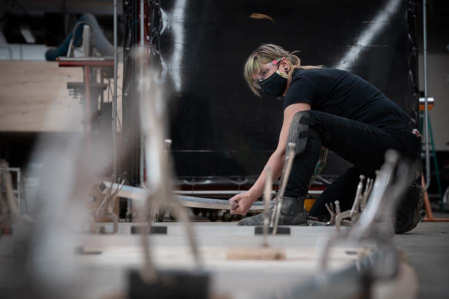 “It’s a relief to see things moving again,” director of production Barney Bayliss said in late October of 2021. At the company’s facility in Toronto’s east end, a pair of massive black wings, each 26 feet wide, are spread out on the floor to be painted by hand. Set on an aluminum frame, they will cover the entire proscenium when closed, swinging up and out to reveal the stage.