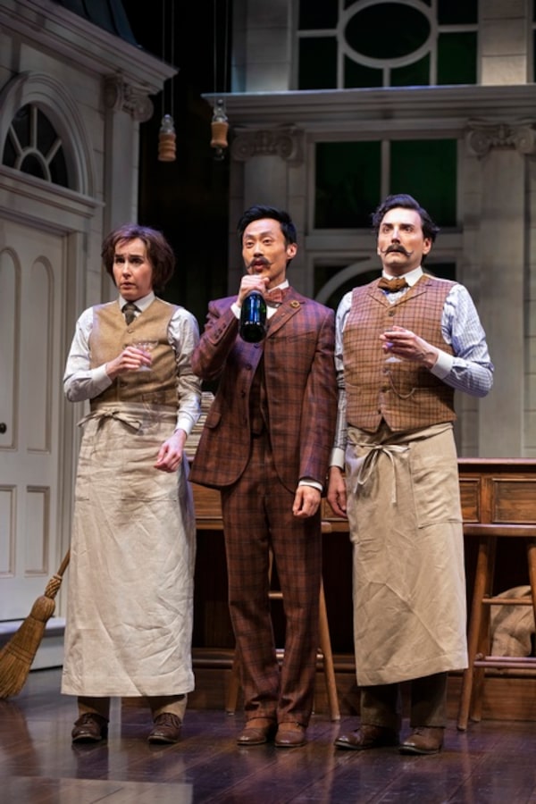 From the left: Kristi Frank as Christopher, Jonathan Tan as Melchior and Mike Nadajewski as Weinberl in On the Razzle.Emily Cooper/Shaw Festival