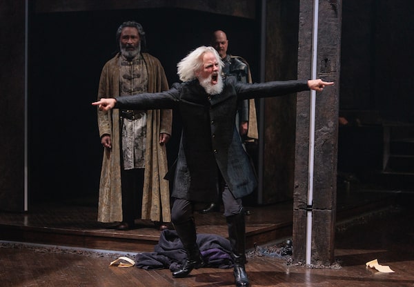Paul Gross (front) as King Lear with Anthony Santiago (left) as Earl of Gloucester and John Kirkpatrick as Curan in King Lear.David Hou/Stratford Festival