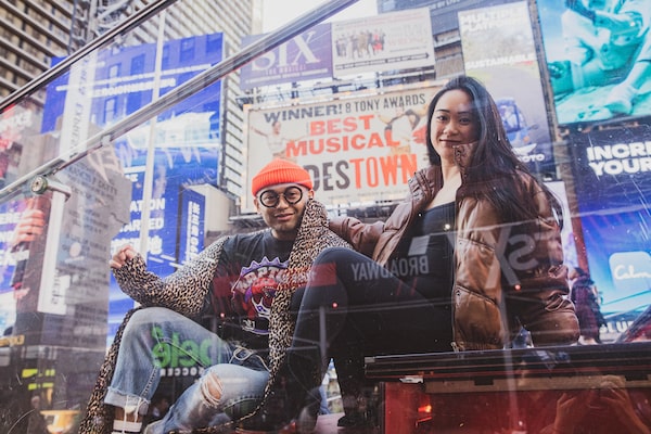 Posing on the steps of the Broadway discount-ticket booth, Madjus and Macasaet laughed and draped themselves over each other like old friends. (Another COVID-19 precaution: Everyone on site for the shoot had to present a fresh negative PCR test, including this journalist.)