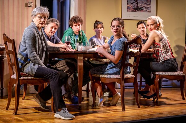 From the left, Rosemary Dunsmore, Jonathan Goad, Finley Burke, Michelle Monteith, Maja Vujicic, Matthew Edison and Amy Rutherford in Public Enemy at Canadian Stage.Dahlia Katz/Supplied