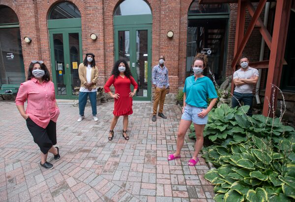 From left, Monica Esteves, Raoul Wilke, Carmen Romero, Travis Knight, Alyssa Martin and Brendan Healy are photographed in the courtyard at Canadian Stage on Sept. 2, 2020. Esteves is the executive director at Canadian Stage, Healy is the artistic director. Wilke, Romero, Martin and Knight are dancers who will be performing at Canadian Stage's solo in High Park.Fred Lum/The Globe and Mail