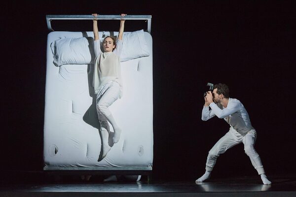 Nocturnes, the final piece on the program, was gorgeous if uneven. Choreographed by Tétrault, Marcos Morau and Isabelle Chassé, the eight-member ensemble performed in a dreamlike white space, flush with surrealist imagery. The opening was arresting, with Plamondon performing a solo on a large bed in front of a flashing TV screen to a Chopin nocturne. Suddenly, a chorus of people emerge from beneath to become a comical background to her dancing – twisting and piling into collective shapes that seem like an externalization of her subconscious.