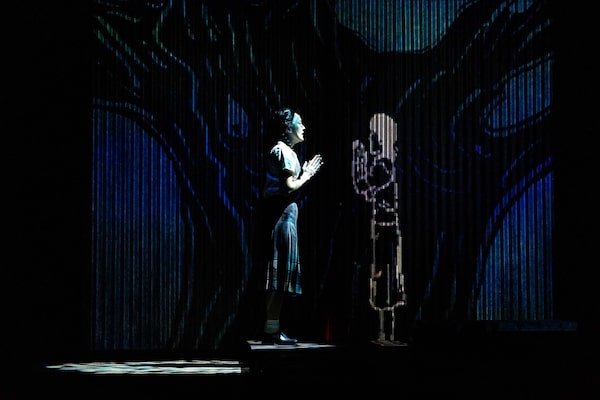 The staging by director Stafford Arima slips back and forth between their worlds and perspectives with the help of giant shoji – Japanese sliding doors – designed by Pam Johnson and frequently covered with contextualizing projections of historical pictures and animations.