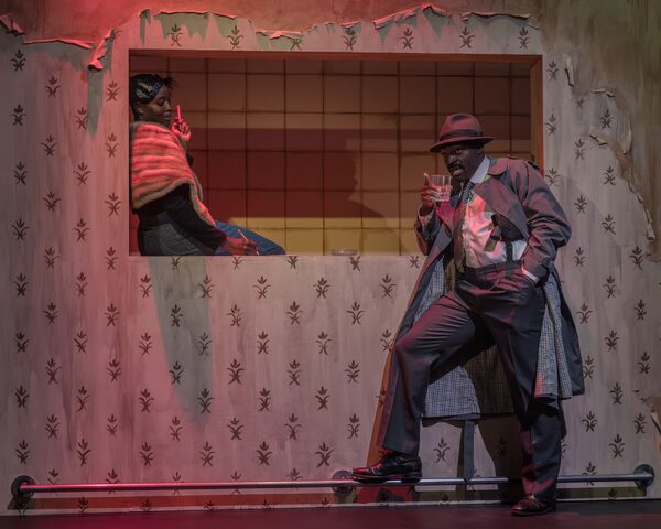 Set designer Michelle Tracey does a lot with a little, using three flats, a bench, an abused pay phone and Logan Raju Cracknell’s lurid lighting to create the atmosphere of a punk concert. A shaft of neon-green glare pours out of a sewer grating downstage, Zucco crashing through one graffitied wall to announce his presence. As an efficient stage crew rotates these walls, they become chintzy apartments, prison barriers, a subway station, a den of iniquity in rough Little Chicago and even a park outfitted with rolled-out plastic grass. An LED scroller announces the titles of the disconnected scenes we’re about to see, a series of metaphorical film strips about Zucco’s life. As his reign of terror progresses, the set gradually fills with wanted posters, blinds and grates bearing his face.