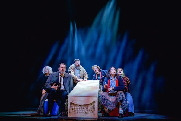 The songs are a blessed relief from the comedy, which begins with a bumbling gang stealing a body from a funeral parlour and taking it by boat to an island called God’s Back Pocket. The purloined corpse is Peggy O’Brien (Kelly-Ann Evans), who is chatting to us in the afterlife, while the gang turns out to be her family and friends. They’re obeying Peggy’s last wishes by holding a prefuneral wake in her old clapboard house.