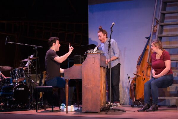 Brandon Kleiman’s two-floor set, a cozy, wall-less apartment with a loft space up a ladder, sits at the centre of the stage with the vastness behind it exposed. It looks like a comment on how small and big “show business” is at once for an actor; one moment you’re in a show at the Fringe Festival that costs $10 a ticket, the next people are paying hundreds of dollars to see you perform on Broadway.