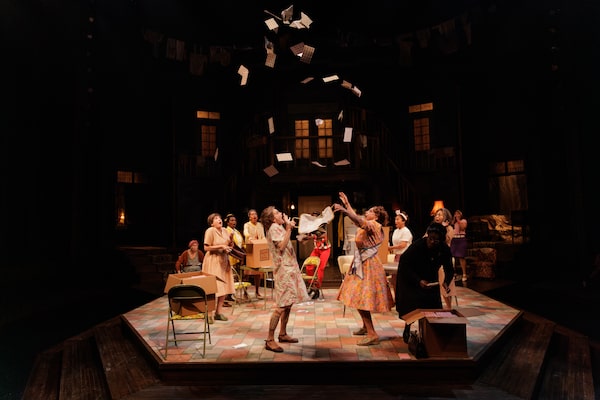 Jamillah Ross as Rhéauna Bibeau (centre left) and Akosua Amo-Adem as Angéline Sauvé (centre right) with members of the company in Les Belles-Soeurs.David Hou/Stratford Festival