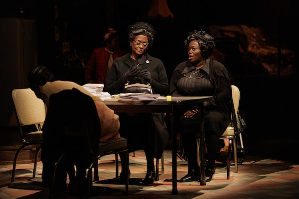 Joella Crichton as Yvette Longpré with (from left) Jennifer Villaverde as Lisette de Courval, Shannon Taylor as Marie-Ange Brouillette and Bola Aiyeola as Des-Neiges Verrette in Les Belles-Soeurs.David Hou/Stratford Festival
