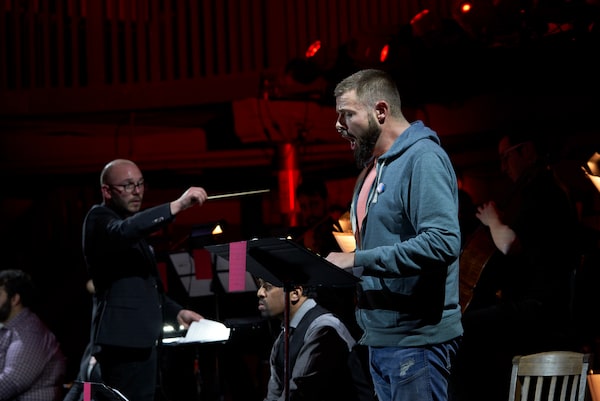 Against the Grain Theatre's music director Topher Mokrzewski conducts Bound while David Trudgen, right, sings the story of Kelly Davidson.