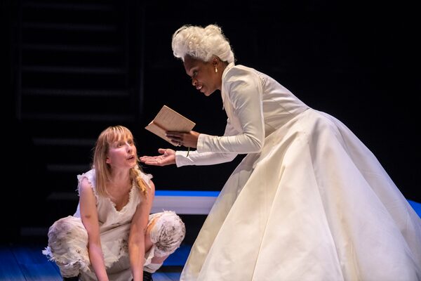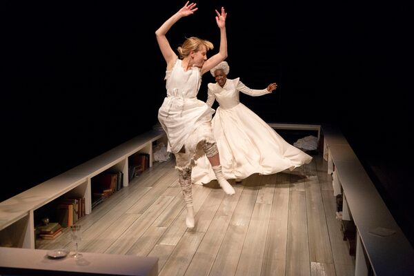 Instead of trying to cure the dialogue, however, Dimitrijevic and her cast highlight its awkwardness and aloofness. Swaddled in a giant white gown and wearing a comical white wig, McIntosh speaks as if she is in her own world, disconnected from reality. The pacing is ponderous.
