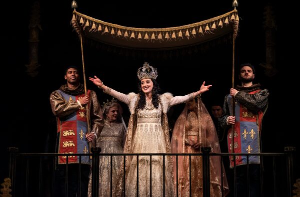 Boleyn (an exuberant Alexandra Lainfiesta) gets shorter shrift. She is a fascinating figure when first introduced, a party girl who tells a confidant (the wry Kim Horsman) that “I would not be a queen / For all the world.” Unfortunately, we don’t get to see how she deals with a world of disappointment. After a glimpse at coronation, she ominously vanishes – giving birth to Elizabeth off-stage.
