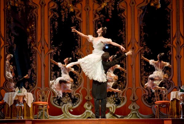 Based on Hungarian composer Franz Lehar’s 1905 operetta, and using his original orchestration (arranged by John Lanchbery), the ballet’s chief musical motif is, unsurprisingly, the waltz. Perhaps no dance evokes the elegance and majesty of the last years of the Austro-Hungarian Empire quite like this three-quarter signature step, whose Viennese incarnation has a dreamlike essence, able to distort our sense of time. Though the footwork isn’t slow, this waltz has a slow-motion spirit, an impression created by the discord between the upper and lower body. Bending backwards and clasping their arms high, the dancers appear to float over their own legs, catching the breeze as their feet propel them into wide, circular configurations. For a sequence in Act 1, which is set in the Pontevedrian embassy, the effect is hypnotic.