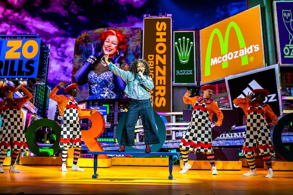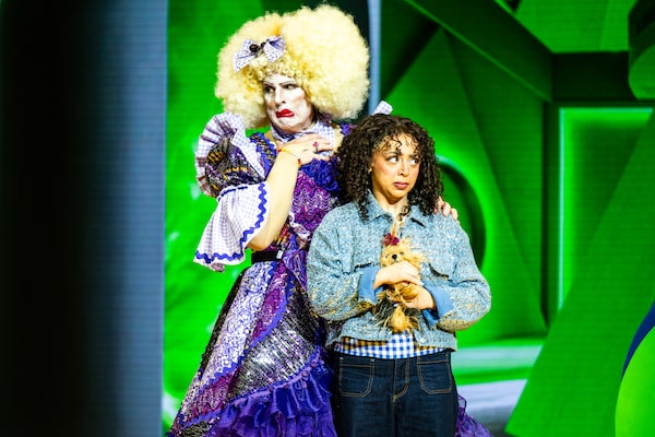 We meet Dorothy (Six’s Julia Pulo, in fine vocal form here) on an eggplant farm in Guelph, Ont. L. Frank Baum’s Aunt Em has been replaced with Plumbum, a beloved recurring character. Seeing the sassy sidekick back onstage (played as always by Dan Chameroy with razor-sharp wit and huge heart) feels like reconnecting with an old friend. Even after the break, Plumbum’s lost none of her sparkle, both metaphorically and literally: She’s dressed this time in a fabulously gaudy purple tutu designed by Ming Wong.