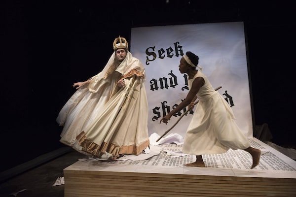 Indeed, Bannerman, Graeme Somerville and Ben Sanders are laugh-out-loud funny as some such white dudes in beards, amusingly impotent versions of competing Old Testament ideas of omnipotence. The action all takes place on a giant Bible brilliantly designed by Camellia Koo that characters pop out of and tear apart page by page as the play progresses. (In Shaw's short story, the pages keep dissolving.)