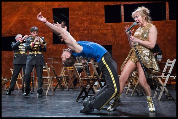 At its centre is a stricken trombonist, reduced by some terminal condition to merely playing the cymbals. The actor Wim Opbrouck initially offers a heavy figure of breathless ill health who threatens to collapse at any moment before emerging as an anarchic sprite of boundless energy who throws himself into self-pitying speeches, grandiose goodbyes and final flings, performed with much physicality plus a smattering of English, French, Italian and German.
