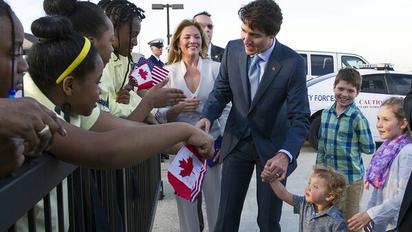 Canadian Prime Minister Justin Trudeau and his wife Sophie Grégoire-Trudeau, and their children, greet students from Paterson Elementary School, in Washington, as they arrive at Andrews Air Force Base, Md., Wednesday, March 9, 2016.Cliff Owen/The Associated Press