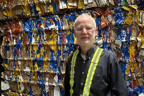 Linden Gossen, national environmental health and safety manager at Sleeman Breweries, stands in front of compressed cardboard ready for recycling.Supplied