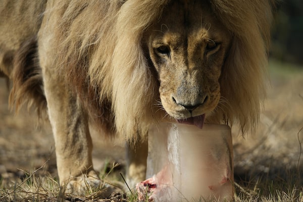 Tiembe, a 15-year-old Angolan lion, licks his frozen breakfast, chunks of red meat and bone packed in a block of ice, at the Attica Zoological Park in Spata suburb, eastern Athens, on Aug. 4.Thanassis Stavrakis/The Associated Press