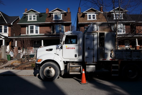 Aecon Group Inc. signage is displayed on a truck parked at a construction site in Toronto on Feb. 26, 2018. Aecon reported quarterly results on Thursday.Cole Burston/Bloomberg