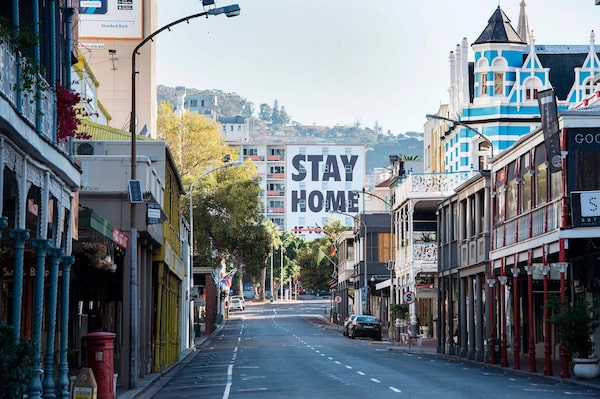 A general view of Long Street, usually one of the busiest and most popular entertainment areas in Cape Town, with a billboard reading Stay Home, in South Africa on April 3, 2020.RODGER BOSCH/AFP/Getty Images
