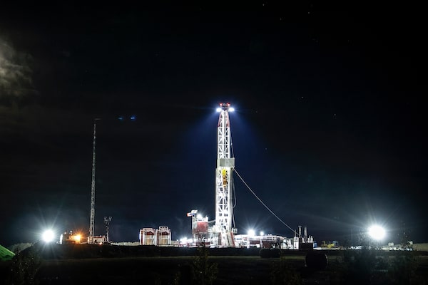 An oil rig drills a well under moon light near Cremona, Alta., on Sept. 24, 2023. Drilling expertise runs deep in Alberta owing to the province’s long history with oil and gas, but industries that can lower greenhouse-gas emissions also rely on the technology.Jeff McIntosh/The Canadian Press