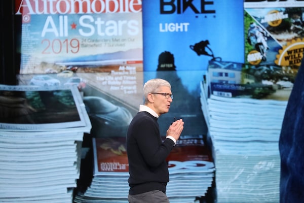 Tim Cook, Apple's chief executive, announces new streaming services at the Steve Jobs Theater on the Apple Park campus in Cupertino, Calif., on March 25, 2019.JIM WILSON/NYT