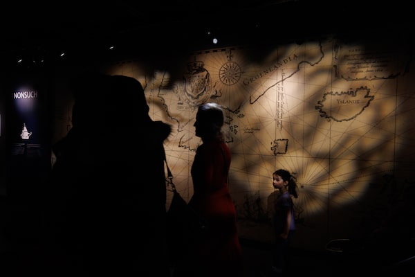 Visitors to the Manitoba Museum walk by a map showing the route of the ship that launched the Hudson's Bay Company when it sailed from England in 1668 to trade for furs in Hudson Bay, in downtown Winnipeg, in March, 2023.NASUNA STUART-ULIN/The New York Times