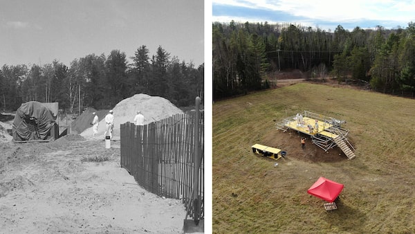 In 1953, workers prepares to bury the calandria of the NRX nuclear reactor in Chalk River, Ont. Seventy years later, a platform has been built over the site to allow workers to excavate down to it.Supplied