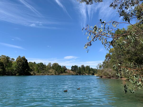 Two ducks paddle across the turquoise water, a gentle breeze rustling the gum trees that surround this small, picturesque lake in rural Western Australia.
