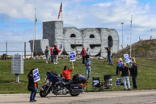 United Auto Workers hold signs while on strike Friday, Sept. 15, 2023, at the Stellantis Toledo Assembly Complex in Toledo, Ohio.Jeremy Wadsworth/The Associated Press