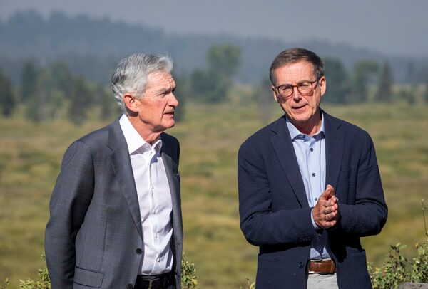 Fed Chair Jerome Powell, left, meets with Bank of Canada Governor Tiff Macklem near Moran, Wyo., in 2024. The central bank leaders have been monitoring the effects of U.S. tariffs on their countries' economies before easing rates.Amber Baesler/The Associated Press