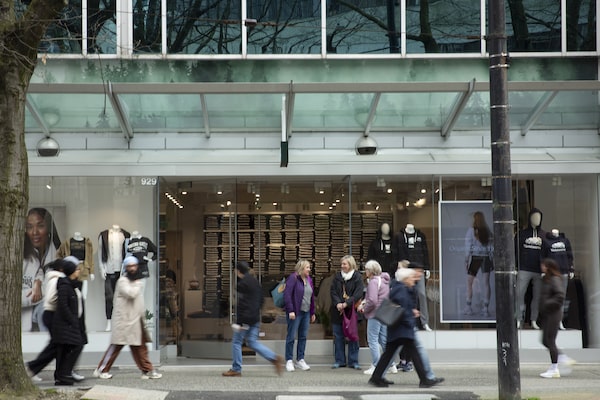 People outside the Roots store on Robson and Burrard in downtown Vancouver on April 1.Isabella Falsetti/The Globe and Mail