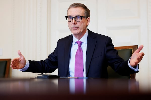 Bank of Canada Governor Tiff Macklem takes part in an interview after announcing an interest rate decision in Ottawa on Jan. 25. Macklem announced the central bank will not increase interest rates in his March 8 update.BLAIR GABLE/Reuters