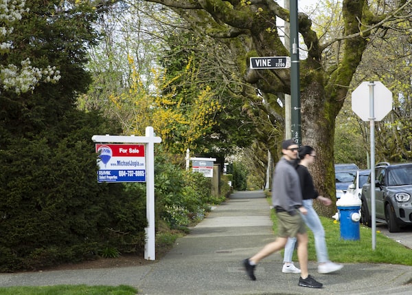 People walk past for sale signs in Kitsilano, Vancouver, B.C. Shaun Cathcart, senior economist at the Canadian Real Estate Association, says the Bank of Canada’s announcement signalled that inflationary pressures may also raise home prices.Isabella Falsetti/The Globe and Mail