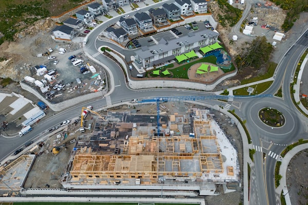 A rental apartment complex under construction, bottom, and houses are seen in an aerial view at a new housing development in Langford, B.C., on May 30, 2024.DARRYL DYCK/The Canadian Press