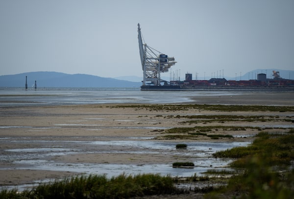 Gantry cranes used to load and unload cargo containers from ships sit idle at Global Container Terminals at Deltaport, in Delta, B.C., in July, 2023.DARRYL DYCK/The Canadian Press