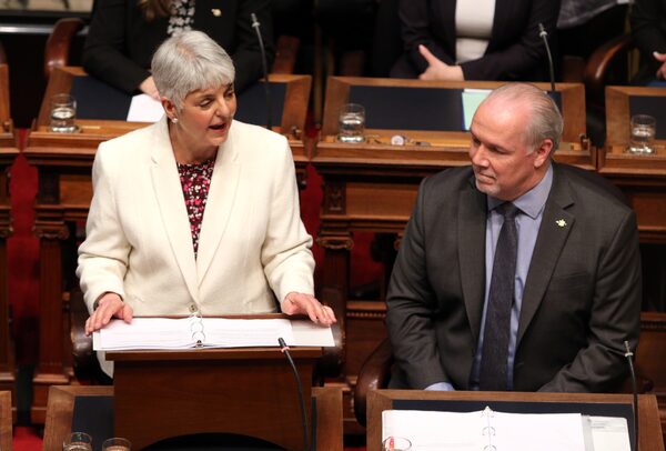 Premier John Horgan looks on as Finance Minister Carole James delivers the budget speech at the legislature in Victoria on Feb. 19, 2018.CHAD HIPOLITO/The Canadian Press