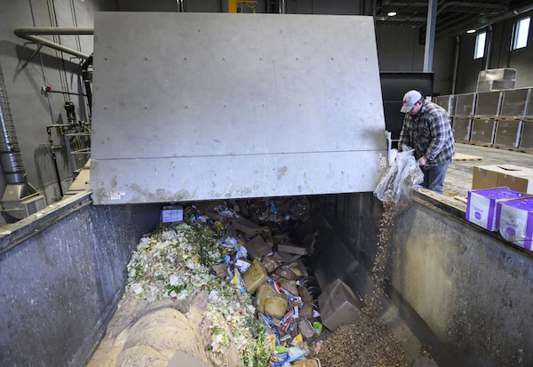 Jayden Dick puts food waste into the packer at Dicklands Biogas. The plant is the largest digester in B.C., and can produce 180,000 gigajoules of biogas a year.Jennifer Gauthier/The Globe and Mail