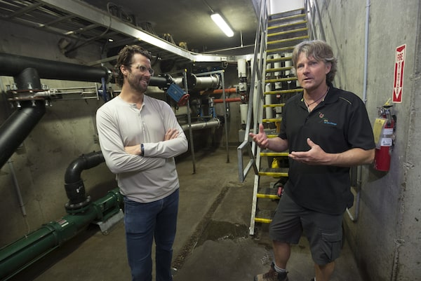EverGen CEO Chase Edgelow, left, and GrowTEC co-founder Chris Perry, right, speak during a tour in the processing basement of the GrowTEC anaerobic digesters at The Perry Farm in Chin, Alta., on July 20.Ian Martens/The Globe and Mail