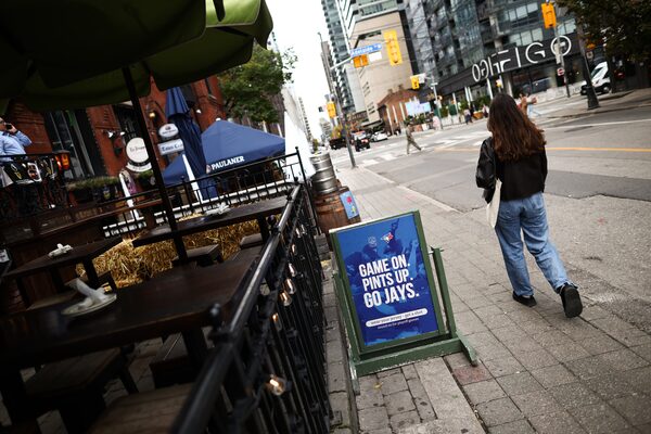 Blue Jays signage outside a bar in downtown Toronto, on Tuesday.Cole Burston/The Globe and Mail