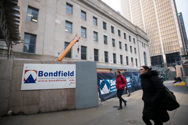 Construction hoarding outside Union Station bearing the name of Bondfield Construction on Jan. 14 2020.Fred Lum/The Globe and Mail