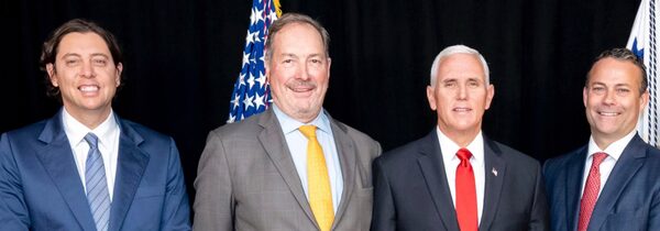 Sean McCoshen (left), former A2A executive Robert Dove (second from left) and Bridging Finance CEO David Sharpe (right) pose with then U.S. vice-president Mike Pence after a speech he delivered at the Wilson Center in Washington, D.C., in fall 2019. The trio were in D.C. to lobby the Trump administration on the proposed railway.Supplied