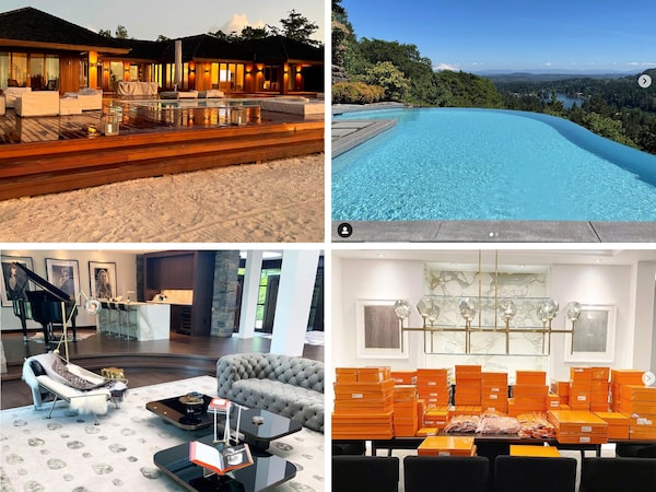Sean McCoshen amassed a pricey portfolio of luxury homes, several photos of which were posted on Instagram by his interior designer. Clockwise from top left: his beachside home in Turks and Caicos, which he bought in 2019 and is now up for sale; his mansion in Lake Oswego, Ore., featuring a zero-edge pool; Mr. McCoshen’s supply of Hermès China for his Lake Oswego home; and his house in Winnipeg, which the designer injected with a “rock-star vibe,” complete with rare photos of Mick Jagger, Keith Richards and Brigitte Bardot. Mr. McCoshen sold the house in 2020.Instagram