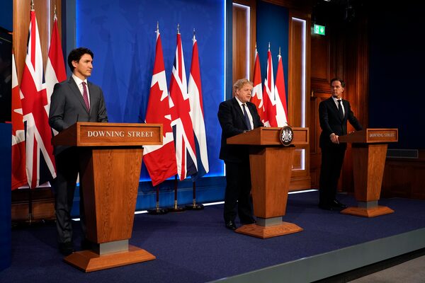 Britain's Prime Minister Boris Johnson, center, Canadian Prime Minster Justin Trudeau, left, and Netherlands Prime Minister Mark Rutte attend a press conference at Downing Street in London, Monday, March 7, 2022.Alberto Pezzali/The Associated Press