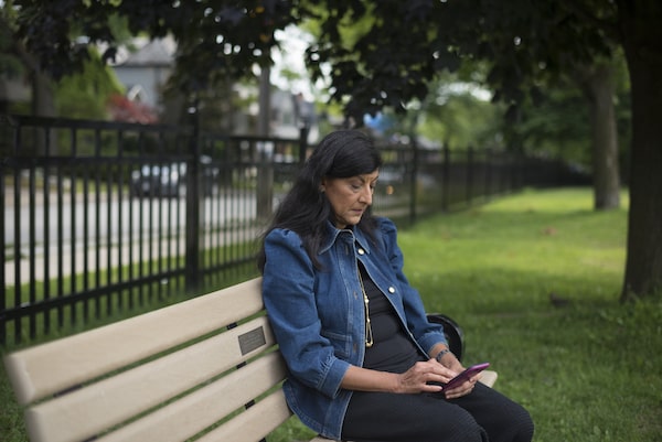 Zabeen Hirji responds to a work email on her phone while out at a park near her home in Toronto on July 14, 2021.Tijana Martin/The Globe and Mail