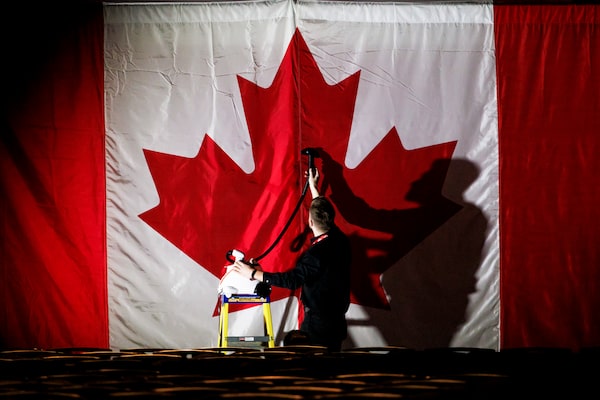 A worker irons a Canadian flag before a Liberal Party’s gathering to announce its new leader in Ottawa. March 9, 2025.COLE BURSTON/The New York Times News Service