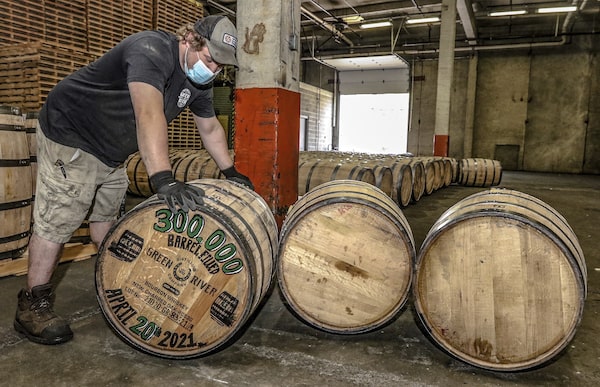 A Green River Distilling Co. employee rolls barrels of bourbon at its warehouse in Owensboro, Ky.